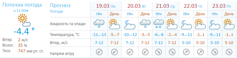 Сайт Укргидрометцентра прогнозирует снег, который начнется днем 20 марта и будет идти до утра 21-го. Ночью обещают -9....-13, днем -2...-7. С понедельника мороз начнет уменьшаться и уже в четверг ожидается -1...+1.