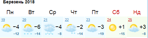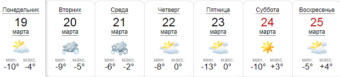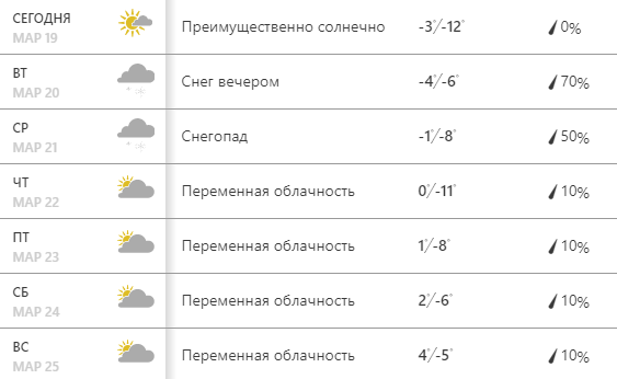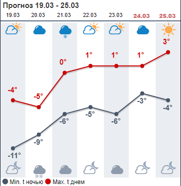 Сайт Weather.com сообщает, что до среды, днем будет держаться минусовая температура -1...-3. С четверга днем ожидается плюсовая температура +1...+4. Снег возможен 20 и 21 марта.